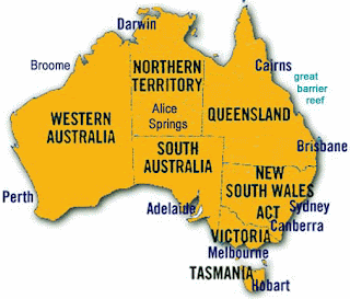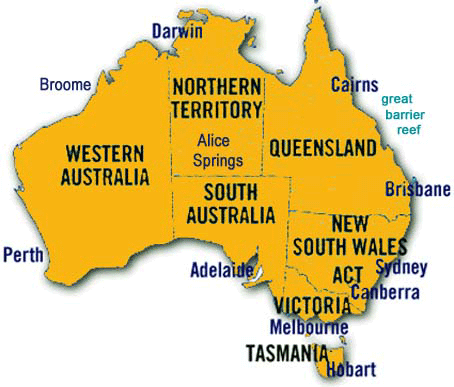6 états (New South Wales, Victoria, Queensland, South Autralia, Western Australia, Tasmania) et 2 territoires (Northern Territory, Australian Capital Territory)